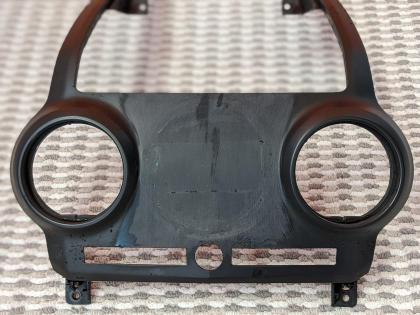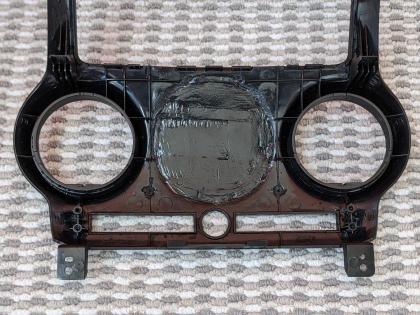 Для этого нашёл куски чёрного ABS пластика и три флакона дихлорэтана. Взял штатную панель и низ заклеил кусками пластика подготовил внизу основу для того чтобы когда спиливать центральную часть не получилась огромная дырень. верхнее крепление кнопок перенёс вниз, с каждой стороны по два.
