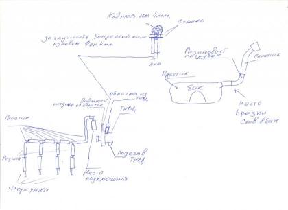 выглядит это так . отправлю фото подключений . - как бы так. и сейчас еще отчет о проделанной работе и тестах . только кратко без фото , здесь фото схемы которая работает . это выдержки , из переписок . не скрою . Но мы не можем сразу дать общий результат . Так как есть ответственность перед форумом . Вообщем это мое письмо , так , что судите меня за это. Сегодня снял рукав от насоса(ТНВД), который идет на обратку в бак . Проверил что с него течет : а течет не хило - за минуту 1-1,5 литра - воздуха в струе не видно. Врезку сделал в этот рукав , для обратки которая идет от форсунок , проехал Сделал тест в движении . и На тест АКПП. Вот результат : И так сделаем уточнения , чтоб ты понимал о том , что пишу . 1. "стандартное подключение" обратки форсунок -это то , что мы приняли на своих машинах. 2. "свободное подключение" обратки форсунок - это подключение обратки в проведенный мною шланг в заливную горловину , с глушением приемного штуцера обратки от форсунок на ТНВД. 3. " силовое подключение " обратки форсунок -это врезка в основную магистраль обратки ТНВД с глушением приемного штуцера от форсунок на ТНВД. И так : 1. при "стандартном подключении "трубка (диффузная) выкачивает топливо обратки из форсунок . - Замеченные симптомы - Плавание оборотов от 750 до 650 Проявляется цокот на ХХ, звонкая работа мотора при ускорении . Практически отсутствует "дежурный режим" 2.при "свободном подключении " - обратка от форсунок течет сама по себе во врезку заливной горловины бака по своему вновь проведенному рукаву . - Замеченные симптомы - мотор работает ровно и мягко , обороты реагируют только на нагрузку по электрической части. Цокота -нет. При разгоне нет звона мотра. оптимальный "дежурный режим" 3. при "силовом подключение " - обратка от форсунок врезана в рукав обратки ТНВД , штуцер (диффузный ) заглушен. - Замеченные симптомы- У мотора плавают обороты от 750-900 , работает мягко , чувствуется повышенная динамика разгона . Цокота -нет. Сильная задержка "дежурного режима" Из все этого - вывод В первом случае нехватка топлива на ХХ и разгоне , Во втором Идеально . В третьем Сильное подпорное давление - думаю в рукаве обратки от ТНВД 1бар - и потому обратка с форсунок не может его пересилить , и образуется подпор топлива и такая динамика , описанная выше. Фото "свободного подключения" Все думаю . нет конечно , есть идеи , которые мы обсуждаем . Только не сразу . Проехал на этом более 1600км в различных режимах . Нареканий нет . Можете критиковать - форум для этого и создан - ответственность за эту публикацию несу только я один .