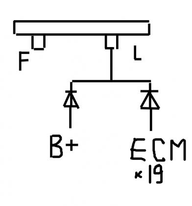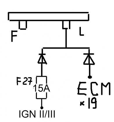 19. Не правильно указал что диод подключен на прямую к В+ (т.е. к батарее) . Этот провод от диода надо подключать на линию IGN II/III , конкретно у меня соединен к преду F27.