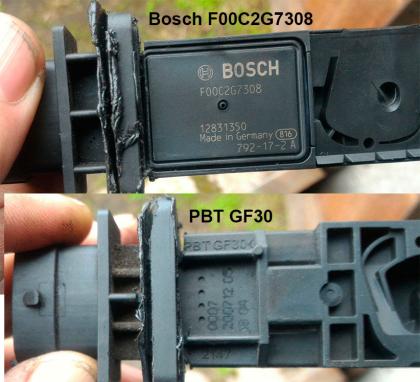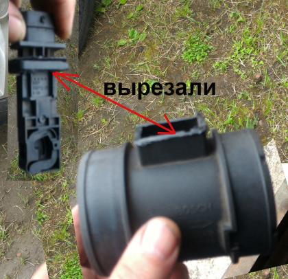 так и не нашел отдельной темы по этому важному прибору. У меня на авто 2009г (дизель 2.0) стоит MAF 0281002618 ( GM 55350048 ). Один датчик вышел из строя из-за моей ошибки по чистки его средством для карбюратора. В результате он выдавал правильные данные для ЭБУ (на них и строится расход топлива) до момента пока я резко не нажимал на газ. Тогда следовал "кивок", двигатель тупел, как бык перед красной тряпкой, выскакивала ошибка Р0101-12 одна или вместе с Р02E1.11. и расход увеличивался с 6-8 до 15-19, что мне не нравилось. ) А второй который я купил примерно год назад в евроавто также приказал долго жить около месяц назад, его показания стали странными и сумбурными, то все нормально, то расход от 20 -25, но авто ускорялось при этом хорошо ) так периодически в течении месяца меняя MAFы ( в зависимости куда ехать -спокойно по городу или быстро за город), стирая ошибки и катался :unknw: но подходит время отпуска и как то надо определяться: ехать спокойно, печально или с большим расходом или покупать еще раз датчик. Цена в евроавто на август 2017г этого датчики 2500 р. т.к. все равно датчики неисправны решил один разобрать... а вдруг :D: . Взял болгарку и отрезал... верх от бочонка (пропилил по периметру на глубину 5 мм). Вытащил вставку, которая имеет свой номер Bosch F00C2G7308. Вставка состоит из 2-х частей - управляющая схема и пластина меняющая свои характеристик в зависимости от скорость воздуха в бочонке. Пластина ( на нижнем фото цифра 1) эта размером 3х3 мм, в центре есть очень тонкая вставка (видимо это и есть платина) (на фото она видна рядом с цифрой 2) От пластины к управ схеме идет примерно 10 очень-очень тонких проводков (на фото их не видно, они где цифра 3). Путь воздуха указан красной линией, он идет по спирали. Стал понятен правильный метод чистки датчика: переворачиваем разъемом вниз и направляем струю жидкости для чистки ДМРВ в отверстие для забора воздуха на конце вставки. именно так жидкость попадет в пластине с платиной, если вообще чистка как таковая возможна при таком строении датчика.