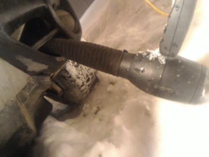 1. Не усмотрел и оставил летний омыватель, а тут поехали кататься по Вепским лесам и все замерзло, ибо там в воскресенье 07,11,16 утром было -14, потом правда потеплело до -6. Но это уже не помогло, все замерзло в бачке. Т.к. необходимого инструмента (обычный фен) не было под рукой, пришлось все делать по возвращению в СПБ Берем фен (у жены, пока она не видит), ставим максимальные режимы нагрева и засовываем его в отверстие "юбки" со стороны водителя, но надо найти какую то трубку/воздуховод, что бы ее сплющить ибо отверстия в "юбке" овальные,а у фена выход обычно круглый, да и тянуться надо до бачка примерно 10 см.. Минут 5-10 и все отогрелось, конечно форсунки и трубки идущие по левому крылу (в моторном отсеке они видны) также надо прогреть. Потом пускаешь моторчик и моешь лобовое стекло пока не закончиться жидкость,а потом наливаешь новую незамерзайку. Попытки засунуть фен сверху ни к чему не приведут, т.к. бачок спрятан под подкрылком и горячий воздух туда сверху не доходит.
