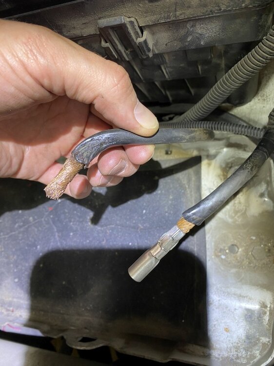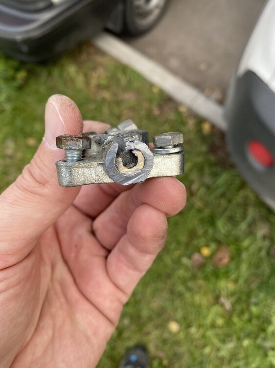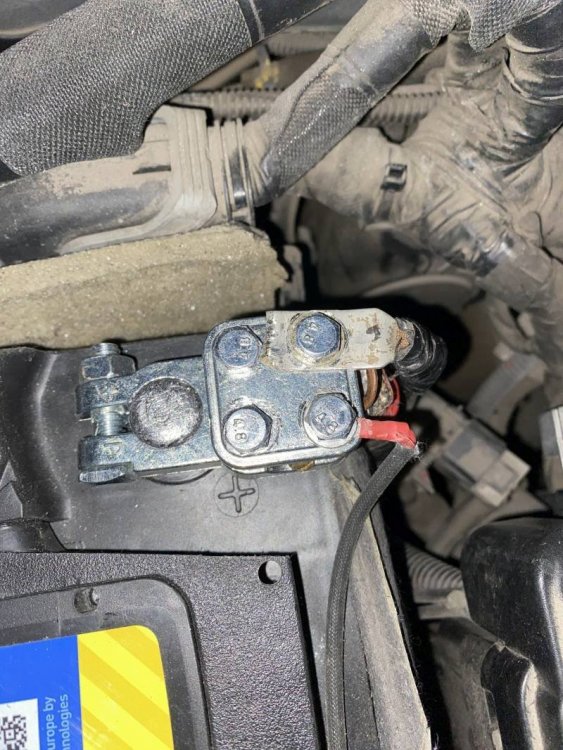12. Так все и вышло, спасибо. Все оказалось до банального просто: Размотал изоленту и под ней почерневший от температуры участок клеммы на котором и терялось больше половины напряжения - результат моей "оптимизации" силовой проводки, когда я увидел что штатные клеммы плохо затягиваются да и вообще какие-то тонкие на вид, и решил поменять их на что-то более мощное. При этом старую клемму до конца не удалял, только отпилил зажимное кольцо и получившуюся культю запрессовал гидравлической обжимкой КВТ на 12 тонн в новый наконечник. Несмотря на всю мощность обжима, между двумя металлами за два года образовалась оксидная пленка, которая за два года превратилась в резистор, который в один прекрасный день практически погасил все напряжение от аккумулятора. Хотя при вскрытии слои металла прилегали плотно друг к другу и предположить что там может быть проблема на вид было очень сложно. Видимо, нарастающее сопротивление послужило причиной ухудшающегося запуска осенью с наступлением холодов, когда даже после замены свечи накала мне приходилось крутить стартер чуть дольше обычного, и я уже начал грешить на известную проблему с плохим контактом на шпильке втягивающего реле, готовясь к потенциальной замене силовой проводки. Это на заметку тем кто наблюдает такие же симптомы и грешит на стартер или его контакты - начать диагностику стОит чуть выше. В итоге клемму заменил на такую, зачистив остатки заводской до блеска и зажал в новую клемму с медными прокладками: Минусовую клемму трогать пока не стал, она у меня запараллелена дополнительной перемычкой 35 кв. мм на другой участок кузова. После этого все вопросы с запуском исчезли: вчера после ночной стоянки на морозе -27 машина завелась с двух оборотов стартера.