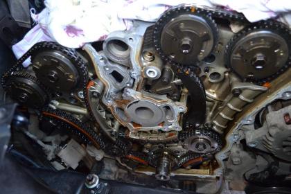 Cloyes - США. Там всё не критично изнашивается, это как с маслом, авто и 15 и 30 и даже 60 т.км. может без смены проехать. ) Видел я эту статью на драйве, у автора что-то совсем запущенный авто, все внутри в гуталине, на звездах очень заметный и неприятный износ в месте с контакта с звеньями цепи, я бы однозначно поменял, а он считает это нормальным. Вот состояние моего авто, пофотал сразу как вскрыл. Темные пятна - лужицы рабочего масла GM дексос 2 от Лукойл, год проработало, тыщ 8 к.м. Машине 8 лет пробег 80т.км.
