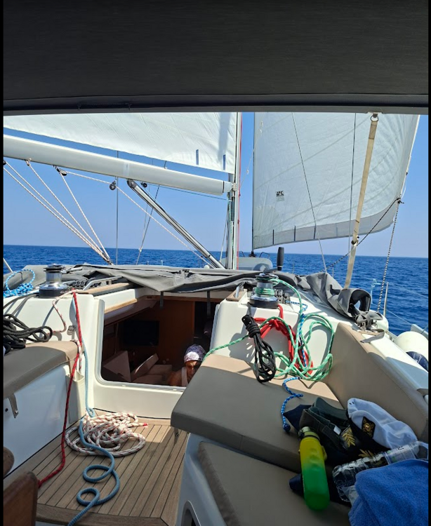 Турция, море тёплое, днем +30-32, ночью комфортно прохладно свежо, даже кондей на лодке не включали. Первый день маршрута, курс фордевинд, паруса бабочкой.
