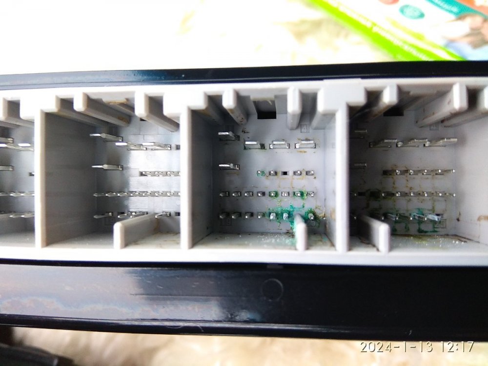 Попробовал почистить пространство между платой и разъемом спиртом, потом продуть, потом тонкой зубочисткой... Ни в коем случае не надо так делать, т.к. там могут быть какие-то элементы. Посыпались окислы, кусочек зеленого покрытия платы (ладно хоть без дорожек)... Поставил на машину... Хуже не стало... Проблема явно под "разъемом". Он проблемный, т.к. большой и цельный на все 7 коннекторов. И рядом с ним еще мелкие элементы. Т.е. надо сначала клон как-то сделать, потом пытаться блок восстанавливать (как запасной оставить).