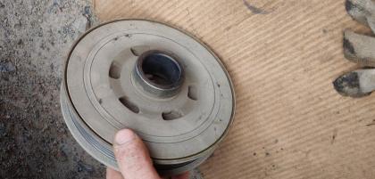 Поменял сегодня шкив , за час управился. Ниже ссылки на видео как работает испорченный шкив и новый. Гайговерт супер, ударами открутил. Новый болт смазал фиксатором, перед работой мною был изготовлен ключ для шкива, взял небольшой кусок трубы на 58 мм. Пробывали с соседом дотянуть через трубу, ну не тут то было, сильно закрутил гайковерт. На старом болте видно зазубрины, видно менял прежний хозяин шкив на 40 т.км пробега.На старом шкиву спереди если надавить на резиновый бордюрчик, кое где прощюпываеться мягкость, может внутри есть порывы. https://youtu.be/vh2XU3nVpSU https://youtu.be/UK-4AdEAK1Q