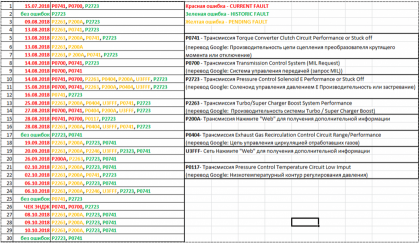 Добрый вечер всем. Вопрос опять по ошибкам влияющим на появление режима пониженной мощности - "чек эндж с стрелкой и машинка". Решил написать в этой теме АКПП, так как предполагаю, что мои ошибки связаны из за многократных поломок коробки (возможно я и не прав) Из истории : 1. данный режим пониженной мощности начал появляться пару лет назад, только очень редко (пару раз в год на трассе), считывать тогда ошибки в контроллере было нечем, поэтому и не знаю об их наличии в тот период. 2. Год назад начались проблемы с коробкой - разрушение вала, насоса, стопорных колец, сгорание пакетов фрикционов, протирание крышки коробки болтами дифференциала... - все эти "ремонты" выполнялись за 7 раз демонтажа/установки коробки с машины , причем у двух разных чел, в третий раз (протирание крышки) уже разбирал и собирал сам. И вот вроде как коробка заработала нормально (не считая периодических мелких толчков, которые уже и не замечаю), но тут начали сыпаться опять эти постоянные ошибки с последующим режимом понижения мощности, причем при поездке летом на юг они появлялись достаточно редко (где то два, три раза в час) я их сбрасывал через Torque и ехал дальше до появления снова. Попав же на днях снова на трассу они меня просто достали : после сброса спустя пару минут снова появляются и причем этот процесс стабильно постоянный. Правда один раз резко стартовал с места и потом этот режим не появлялся несколько часов. Также заметил при поездках на работу (один и тот же маршрут), что этот режим пониженной мощности появляется почти всегда на одном и том же кольце - наверное их (ошибки) появление связано с определенным температурным режимом, который наступает спустя около 12 минут. Ошибки разные и не понятно их полное описание и причины появления. Перевел названия через Google но ничего мне это не дало. Был в паре СТО (наверное просто в некомпетентных в данном вопросе) - говорят что в памяти много ошибок, поэтому не понятно с чем бороться, сбрасывали ошибки и предлагали приезжать сразу же как они появятся - но это не всегда получается сделать... Что можете посоветовать в поиске причин этих ошибок ?