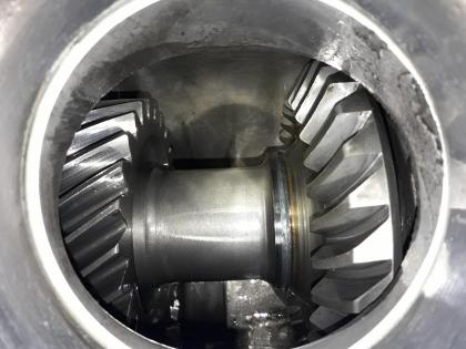 Торец хвостовика чистый -повреждений не обнаружил. Так же если не ошибаюсь, то в этом виде кинематической пары нагрузка на хвостовик направлена по его оси в сторону выхода с редуктора (в сторону заднего моста), если бы был зазор в упорных подшипниках, то шестерни как бы расходились друг от друга в разные стороны и он не мог бы цеплять). Возможно так проявляется усталость металла от передаваемой нагрузки между шестернями.