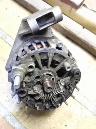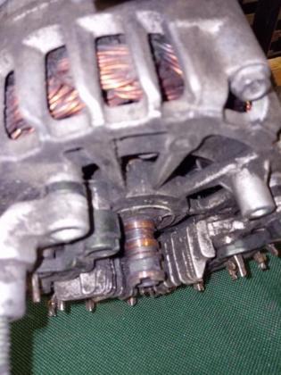 Теперь про сам генератор. Старый был просто залит маслом, причем в хлам. И это при том, что я, к своему стыду, на этой машине ни разу сам не менял масло. Делал это на СТО (Екатеринбург, Щербакова 144, ежели чего). Вот после последнего ТО машина начала вести себя как-то странно, через месяц было замечено мерцание ламп при открытии дверей. К сожалению сразу не обратил на это внимание, вот и получил.... После разборки генератора было выявлено: частичное разрушение контактного кольца и металла вала под ним, треснувшая нижняя плата "подковы". При разборке я долго выковыривал старый генератор, а вот новый стал сразу и быстро, так и хочется сказать - "со щелчком". Дольше всего трахался с установкой короба воздушного фильтра, там один болтик крепления (со стороны фары) ставится под углом и очень тяжело им попасть в резьбу. Пока все работает отлично, при работающем двигателе напряжение 14,4 В по прибору. И еще один прикол - меня последнее время парил такой "хрюкающий" звук справа впереди при езде по неровностям. Сначала грешил на правый амортизатор, но после замены аммортов звук остался. Теперь понял - это "хрюкала" резина правой опоры силового агрегата, когда менял генератор, то очистил весь узел крепления от грязи и пыли. Посторонний звук пропал. Фото битого генератора прилагаю: