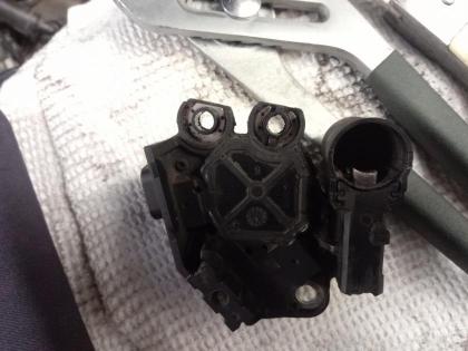 Вот и у меня случилась неприятность - еду себе, все нормально, вдруг загорается значек аккумулятора, нет зарядки. Благо до гаража было не далеко, добрался удачно, заехал, заглушил двигатель. Открываем капот, смотрим, внешне ничего особенного. На всякий случай снял разъем возбуждения генератора, почистил, поставил на место, двигатель завелся , значка аккумулятора нет. Но чудес на свете не бывает. По-этому снимаем клеммы, заряжаем аккумулятор, вновь подключаем клеммы. Напряжение на заглушенном двигателе - 12,88 В. Заводим двигатель, значка аккумулятора нет, измеряем напряжение на клеммах - 12,3 В!!!! Увы, придется вплотную заняться генератором. Здесь я хочу выразить особую благодарность уважаемому DDL, за его пост по снятию щеточного узла генератора. На моем картина была примерно такая же: Задняя, т.е. дальняя на фото щетка разбита в хлам, все засорено смазкой, похожей на графитку. Продолжаем демонтаж. Для этого: 1. Снимаем правую фару 2. Разбираем и снимаем короб воздушного фильтра 3. Снимаем защиту картера и через обрезку ровной доски поддомкрачиваем двигатель 4. Разбираем правую опору силового агрегата 5. Снимаем ремень, для этого действительно отлично подходит простой советский ключ-трещотка. Его длины и моих усилий хватило, чтобы сместив натяжной ролик ослабить и снять ремень 6. Снимаем "паразитный" ролик , для этого осторожно домкратом приподнимаем двигатель. Дело в том, что крепежный болт ролика длинный, надо чтобы он был выше лонжерона Вот такая картинка до снятия генератора. Далее я снял для осмотра и сам узел натяжного ролика и получаем вот это: