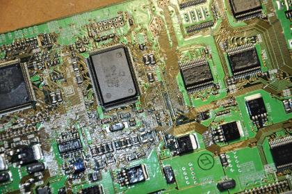 Дилер сказал, что могут только поменять. Думаю, на восстановленную работоспособность попросту не дали бы гарантию. Корродированные ноги уже очищены, на них ничего нет. Эти места красным указаны. Однако сами чипы выглядят странно - есть какая-то шагрень на всех микросхемах, и на двух самых больших какие-то наплывы. И сегодня я внезапно понял, что кончина блока начиналась, похоже, еще неск. месяцев назад. После пуска двигателя несколько раз не работал климат - ни вентилятор, ни заслонки не реагировали вообще на переключатели. ещё что-то барахлило странно. После повторного включения зажигания всё проходило. Списывал на электроглюк.