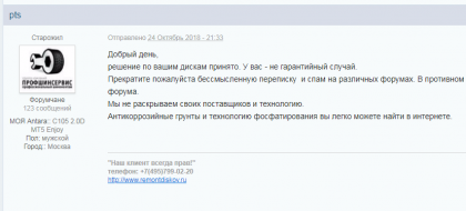 ЭЭЭ ))))) попрошу без оскорблений ... НЕОБОСНОВАННУЮ и ЛЖИВУЮ информацию о нашей фирме. Это у вас необоснованное поведение и лживые отмазки ))) Вы уже неделю "лечите меня по фото". кстати спасибо за фото ) знал бы что с таким дерьмом столкнусь сделал бы свои по чётче и по лучше )) Весь вопрос в том что вы отмазываетсь от своих слов. То что вы сфотографировали диски ДО, это прекрасно ... НО вы или ваши смежники (тайну которых вы так скрываете - фосфатирование и схему антикорозийной обработки) не уведомили что на диске есть "значимая" ( как выясняется постфактум через два сезона, которую не было видно после пескострую и покраски сразу пока не поставилирезину) коррозия и не отметили это в заказ-наряде. Так что ваша псевдо бессрочная гарантия, полная фикция. кстати там где стрелочки вздутия НЕТ ))))))))))))))) пс; еще фотки есть ?? дисков 4 шт , а после окраски ??? )))))00000 ваша организация ни чем ни лучше других ) огласите что лживого было написано.