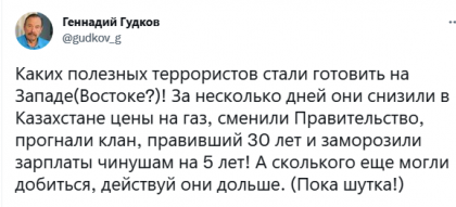 А смысл озвучивать автора, если с агитатором-распространителем из Коми и так всё ясно? )) Особенно забавно читать подобные выковыривания зрады из обеих ноздрей от пропагандонов (А тут еще Казахи обозначили дату вывода ОДКД...., в наглую нассав друзьям в тапки), на фоне того, что для остальных нормальных людей еще 10 января всё было озвучено - «В Казахстан направлен контингент Коллективных миротворческих сил ОДКБ и, хочу это подчеркнуть, на ограниченный по времени период», — сказал Путин в ходе видеоконференции ОДКБ. Он уточнил, что миротворцы направлены на такой период, на какой сочтёт необходимым президент Казахстана. При этом российский президент отметил, что после выполнения задач «весь контингент, безусловно, будет выведен с территории Казахстана». https://russian.rt.com/ussr/news/947308-putin-mirotvorcy-odkb?utm_source=yxnews&utm_medium=desktop