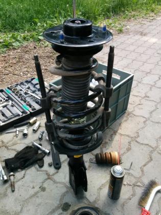 24. Замена стоек! Я конечно Америку не открываю но кто хочет заменить стойки самостоятельно и сэкономить деньги вот мой совет. Сложного ничего нет, для начала надо вооружиться съёмником стоек и стяжкой пружин. Все остальные инструменты думаю есть у каждого. Сначала поднимаем машину домкратом, после фиксируем её на раме, пирамидкой, не забываем поставить её на ручной тормоз или подложить упоры поз задние колёса. Дальше после того как подставили упор под раму, домкрат переносим под шаровую опору на рычаге и поднимаем домкрат до тех пор пока под действием не начнет приподниматься весь кузов. После этого стяжками пружин стягиваем пружины пока не почувствуете что пружина немного проворачивается либо её уже можно руками немного пошатать вправо или влево. Дальше выкручиваете крепление стойки стабилизатора, вытащить стойку получится где-то в среднем положении, то есть опускаете домкрат под рычагом до тех пор пока не почувствуете что стойку можно вытащить. Дальше отсоединяете разъём АВС и откручиваете кронштейн на котором крепиться тормозной шланг и сам провод разъёма АВС. После Открываете капот, снимаете защитный колпачёк и съёмником стоек, там стоит гайка на 21 и круг со сточенными торцами (я использовал съёмник стоек ВАЗ-2110) чтобы открутить и откручиваем поворотную опору 3 гайки на 13, после откручиваем крепление стойки это 2 болта гайки на 21 и выбиваем болты они с насечками и забиты, не пугайтесь что они прикипели там насечки они вбиваются в поворотный кулак и не позволяют болтам прокручиваться. Всё вытаскиваем все в сборе и меняем стойку, если поворотный подшипник и резинка под ней в норме то можно не менять. Я же поменял и опору и подшипник и резинку в которую упирается пружина в верху и резинку которая надевается на стойку и отбойник. Гофры пластиковые я их просто почистил и обратно поставил. После устанавливаем всё на новую стойку, и закручиваем на неё поворотную опору, а затем раскручиваем стяжки пружин и эту конструкцию монтируем в обратной последовательности.