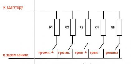 5. Теперь нужен эксперимент, надо разобраться какое соединение понимает магнитола, последовательное как у нас в авто или параллельное? В первом случае наше, во втором вроде как я нарыл в интернете универсальное. Вопрос первый надо ли подбирать номиналы сопротивлений или магнитола всеядная и реагирует на любое изменение напряжения. Вопрос второй в штатной цепи стоят одинаковые потенциалы сопротивления или разные, если разные то не надо перепаивать, достаточно изменить соединение с последовательного на параллельное. Вообщем уезжаю в деревню на 2 недели буду эксперементировать. Если номиналы одинаковые, то в случае последовательного соединения сопротивления будут суммироваться для каждой следующей кнопки, будет формула R1+R2 следующая R1+R2+R3 и так далее по возрастающей, тогда в этом случае если потенциалы сопротивлений будут одинаковые, просто изменить способ подключения на параллельное соединения ничего не изменит. Надо будет менять сопротивления на разные номиналы и соответственно менять способ подключения в цепи. Принцип подключения тогда будет следующий: подключение 4 это подсветка их не трогаем подключение 2,3 это минус в нашем случае земля подключение 1 это левый блок переключения кнопок - KEY1 подключение 6 это правый блок переключения кнопок - KEY2 После подключения попробовать запрограммировать кнопки если не получится тогда надо будет вскрывать коробочку и впервую очередь смотреть номиналы сопротивлений. Вообщем как-то так всё пошёл спать....