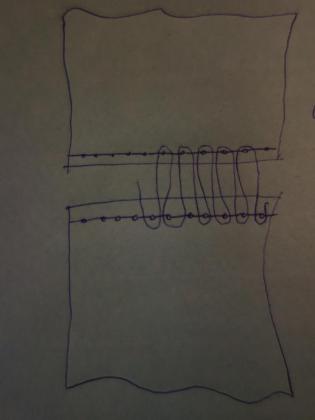 1. Вот так получилось Я шил так, сначала прострачивается по краям кожи, а потом иголкой как на рисунке, а после нитка протягивается. Можно конечно приклеить сначала встык встык а потом ниткой стянуть это уже как кому угодно. Клей лучше Abro