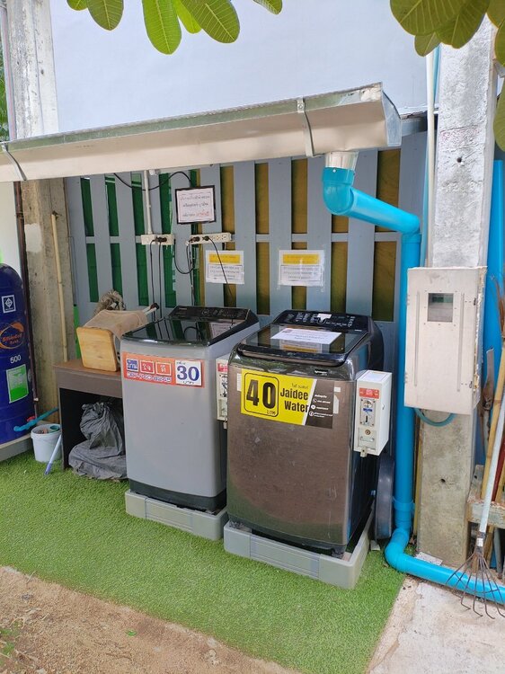 Пока в памяти зацепилось, стиралки холодильники прилично дешевле чем у нас. Бренды корейские китайские, судя по наклейкам гарантии на агрегаты кратно выше чем у нас. Большой ассортимент стиралок с вертикальной загрузкой заявленым объемом 12-14кг. Одна из наших постирочных в корпусе А, Рекомендации на тайском, английском, русском. 😊 И вездесущие франжипани.