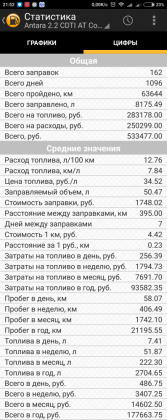 если кому интересно, выкладываю статистику по расходу за 3 года по чекам. также все расходы учтены (налоги, страховка, сервис, ТО, запчасти, штрафы, мойки и т.п.) Итого расходы за 3 года или 63644км составили 533 477руб, в том числе на топливо 283 178руб. Есть статистика, во сколько обходиться 1км пробега, затраты на топливо в неделю, месяц... Соотношение пробега город/трасса примерно 75/25