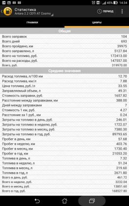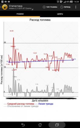Выкладываю наглядную статистику по расходу на рестайлинговом дизеле с момента приобретения в апреле 2014 по настоящий момент - март 2016, т.е. почти 2 года. Заношу при каждой заправке в прогу на андроид-устройстве данные по одометру, количеству ДТ и цену. Средний расход, согласно линии тренда, вырос с 12,22 до 13,15л/100км, хотя вроде должен упасть. Объяснение - изменилось соотношение пробега город/трасса. В первый год эксплуатации оно было меньше. Точно не подсчитывал, но где-то 60/40 в первый год, и 75/25 - во второй. Массу деталей можно узнать из прилагаемых скриншотов, в том числе стоимость 1км, затраты на топливо в день, в год и т.п.. Среднее значение расхода за 2 года эксплуатации 12,7л/100км. Так что не все так грустно.. :) Заправляюсь с августа 2015 только на фирменных Лукойл, до того - на Роснефти. По прожигам: на Роснефти были чаще. На Лукойле реже (может не всегда замечаю) - раз в 2000 - 3000км. Город Липецк небольшой, 700-800 тыс. жителей. Интенсивность пробок по яндексу в час пик 7баллов.