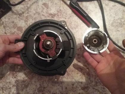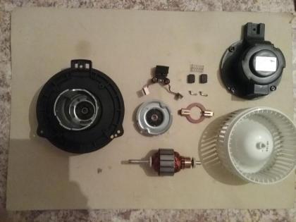 Проделал и я путь переборки вентилятора отопителя, немного фото. В таком виде мне открылось состояние внутренностей, все покрыто толстым слоем металлизированной пыли. К слову от этого может выйти из строя и сам регулятор оборотов. Далее пришлось все жестко мыть и чисть в том числе и саму крыльчатку вентилятора, после я зарекся ставить угольные фильтра, только простые с регулярной заменой. Отмытые начисто все детали вентилятора с крыльчаткой. Вид собранного вентилятора и перечень инструмента для его разбора. Вал якоря под крыльчаткой имел коррозию и пришлось вал тщательно чистить и потом смазывать густой силиконовый смазкой на фото. Подшипники смазывал моторным маслом Mobil 1 0W-40. Собранный вентилятор устанавливается на свое место и прежде чем прикрутить тестово запускается и прослушивается на минимальных и максимальных оборотах, если все устраивает то монтируется на свое место. У меня после монтажа вентилятора не обошлось без доработки, как известно на кузове С145 под вентилятор ставится звукоизолирующий экран, в кузове С105 его ставят только на дизельную машину. Заказал экран Opel/GM 4806863/96820559 цвет антрацит, только для дорестайла, для рестайла свои экраны другого цвета. Экран ставится на свои заводские посадочные места, они уже присутствуют, четыре точки крепления, три винта и одна клипса которая стоит штатно на корпусе блока кондиционирования и вентиляции. Номера винтов, такие же как и винты для вещевого ящика (бардачка), Opel/GM 4803293/94520326, поставляются упаковкой 10 шт, остаток пошел на замену винтов бардачка. Но основная проблема из-за которой я полез в вентиляцию была не в вентиляторе, а в регуляторе температуры. После зимы у меня пропал холодный воздух, даже при работающем кондиционере он был горячим. Подозрение на неисправность пала на привод заслонки горячо/холодно Opel/GM 4803986/96629730. Причина была в сгоревшем моторчике. После замены все стало работать как положено. Небольшой ликбез по нашей системе кондиционирования и вентиляции. Внешний вид блока, виден привод горячо/холодно посередине блока, белого цаета. Блок со стороны ног водителя и привод распределения потоков воздуха по салону белого цвета. Общий вид. Вид клапана рециркуляции с разных сторон со своим приводом. Вид привода заслонки температуры.