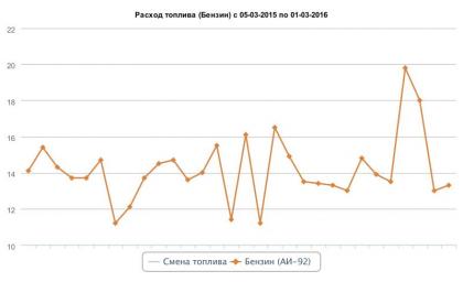 После общения с вами решил что со мной таки что-то не так... Провел тестовую езду :ph34r: . Первую неделю ездил только на ручке, с максимальной передачей (т.е. сразу переключал на передачу выше до 6ой и дальше тошнил на ней). Результат - 13.0 (!) с прогревом - зима -10 -20. Вторую неделю ездил на автомате... но в таком же "тошном" режиме - расход 13.3. Результат - если давить тапку на светофоре - то 20... Если ездить 1-2 км. потом стоянка и еще 1-2 - расход 20... Если ездить и тошнить по 10 км за прогон, без пробок - расход 13. :D: Прикладываю график. P.S. БК показывает чушь всякую. Все расходы приведены по "заправка полного бака"/на километраж одометра. P.P.S. Заполняю бак - делаю две фотки - фотку колонки и фотку одометра, потом сбрасываю одометр. На сайт выкладываю примерно раз в месяц. P.P.P.S. Короче не давите тапку, не едьте быстрее 110 км/ч и будет 13 :). Смотрите картинки: http://www.drivernotes.net/images/lines/0000073/73420.png