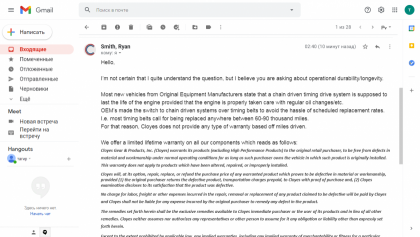 Следующий вопрос господину Смиту. А какой ресурс ваши инженеры закладывают узлу грм оснащённому вашим комплектом. разумеется при условии соблюдения эксплуатационных норм? и он отвечает. гарантия пожизненная. НО! КАК БЫ! подробно в переводе ___________________________________________________________________________________________________________________________ Смит, Райан02:40 (0 минут назад)кому: яПривет,Я не уверен, что вполне понимаю этот вопрос, но мне кажется, что вы спрашиваете о эксплуатационной долговечности/долговечности. Большинство новых автомобилей от производителей оригинального оборудования утверждают, что система привода газораспределения с цепным приводом должна прослужить весь срок службы двигателя при условии надлежащего ухода за ним с регулярными заменами масла и т. д.OEM-производители переключились на системы с цепным приводом вместо зубчатых ремней, чтобы избежать хлопот с плановыми темпами замены.То есть большинство зубчатых ремней требуют замены где-то между 60-90 тысячами миль.По этой причине Cloyes не предоставляет никаких гарантий, основанных на пробеге миль.Мы предлагаем ограниченную пожизненную гарантию на все наши компоненты которая гласит следующее: Cloyes Gear & Products, Inc. (Cloyes) гарантирует, что ее продукция (за исключением высокоэффективных продуктов) будет свободна от дефектов материала и изготовления при нормальных условиях эксплуатации до тех пор, пока такой покупатель владеет транспортным средством, в котором первоначально установлено такое изделие. Настоящая гарантия не распространяется на изделия, которые были изменены, отремонтированы или неправильно установлены. Компания Cloyes по своему усмотрению отремонтирует, заменит или вернет покупную цену любого гарантированного продукта, который окажется дефектным по материалу или качеству изготовления, при условии, что(1) первоначальный покупатель вернет дефектный продукт с предоплатой транспортных расходов компании Cloyes с доказательством покупки и (2) экспертиза Cloyes покажет к своему удовлетворению, что продукт был дефектным. Никакая плата за труд, Фрахт или другие расходы, понесенные при ремонте, удалении или замене любого продукта, заявленного как дефектный, не будет оплачена Cloyes, и Cloyes не несет ответственности за любые расходы, понесенные первоначальным покупателем для устранения любого дефекта продукта. Средства правовой защиты, изложенные в настоящем документе, являются исключительными средствами правовой защиты, доступными непосредственному покупателю Cloyes или пользователю ее продукции, а также вместо всех других средств правовой защиты. Cloyes не принимает и не уполномочивает никаких представителей или других лиц брать на себя какие-либо обязательства или ответственность, кроме прямо указанных в настоящем документе. За исключением случаев, запрещенных применимым законодательством, любые подразумеваемые гарантии, включая любые подразумеваемые гарантии товарной пригодности или пригодности для определенной цели, должны быть ограничены по продолжительности сроком действия явно выраженной гарантии, указанной выше. Некоторые штаты не допускают ограничений на срок действия подразумеваемой гарантии, поэтому вышеуказанные ограничения могут быть неприменимы к вам. Эта гарантия дает вам определенные юридические права, и вы также можете иметь другие права, которые варьируются от штата к шт
