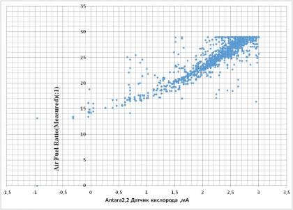 PID 221145 для бензинок. В наборе GM он показывает 43,4mV. У нас широкополосный датчик с подогревом, греется 2 минуты при каждом пуске двигателя до 300-350 град. Опорное напряжение постоянное, поддерживается за счет "накачки" тока, по величине которого и определяется количество кислорода. Возможно опорное показывают PIDs 24 и в торке ff1240 =0,2 V. На ХХ блок управления не поддерживает строго определенный состав смеси, ток ДК находится в диапазоне 4,4 -4,9 mA (зависит скорее всего от атм давления, т.е. один день 4,6, следующий может 4,8 и т.д.). Реальные показания ДК до соотношения 29:1 (лямбда=2) в режиме прожига, в обычном режиме ток ДК выше 3.5мА, при высоких нагрузках уходит в 0 и даже "-". Если отвлечься от мусора, кривая прослеживается.