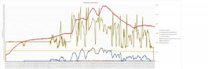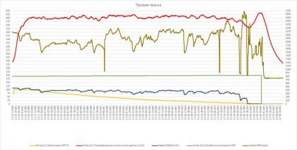 Прежде всего то, что реальные прожиги не соответствуют вашим выводам. Преждевременно не заканчиваются, 20 минут ограничение для любого прожига. При перегреве должно отрубать сразу. Остановить можно При сервисном прожиге какая диагностика и какого оборудования прожига выполняется? Контроль температуры СФ и все! Не выдувает температуру при скорости 100 км\ч и не затягивается прожиг более 20 минут. И еще понятно, что основная наша беда, которая видна в начале первого графика, это невозможность разогреть фильтр до 600 градусов в режиме городского движения. Видны обороты двигателя, при которых на месте можно качественно прожечься, шкала RPM справа.